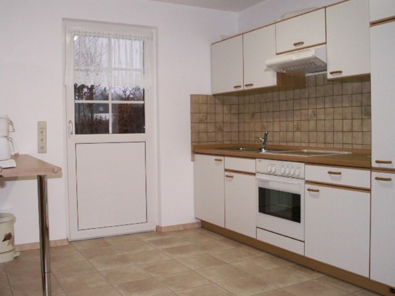 Die Küche ist komplett ausgestattet, über eine Außentür gelangen Sie auf die Südwärts gelegene Terrasse.