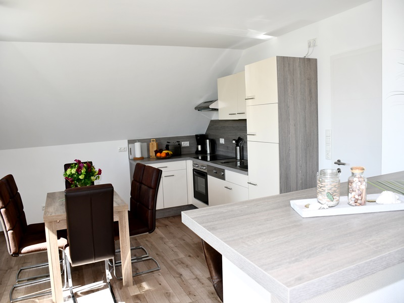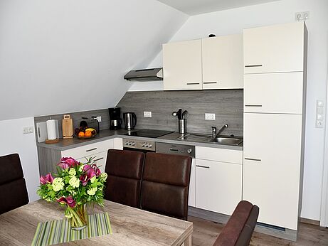 - Küche mit Esstisch, Spülmaschine, Backofen, Ceran-Kochfeld, Mikrowelle,