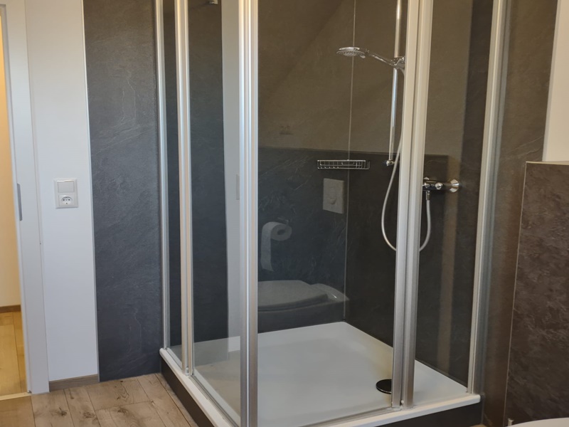 Das Bad verfügt über ein Waschbecken, Dusche und WC.